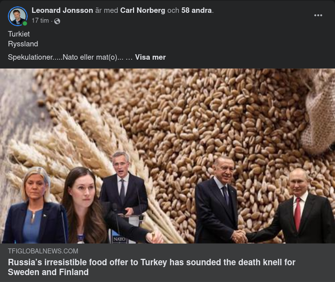 Om EU fortfarande går vidare med utbyggnaden av Nato och inkludering av Sverige och Finland i militäralliansen, så kan Putin lika gärna säga- okej, jag kommer att avbryta korridoren och blockera livsmedelsförsörjningen.