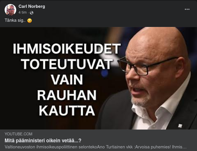 Herr president! Mänskliga rättigheter är den bästa delen av politiken. De kan alltid åberopas, och de kan blockera munnen på en politisk motståndare, det vill säga de är som politikens allmänna nyckel. I Finland tror många att vanliga finländare inte har några mänskliga rättigheter alls. När en svenskspråkig person ansöker om att studera juridik eller medicin hjälper kvoterna redan en bättre ställd sökande. När en finländare vill få en egen grundutbildning på Åland enligt grundlagen får han eller hon den inte, det vill säga finländare diskrimineras öppet på Åland. Med tanke på Axel Olof Freudenthals rasistiska förflutna, grundaren av RKP, kan man undra om kränkningarna av de mänskliga rättigheterna på Åland går tillbaka dit.