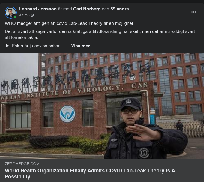 I två år har statliga och globala medicinska institutioner som CDC och WHO tillsammans med lurendrejer som Anthony Fauci hänvisat till argumentet att Covid-19 läckte från virologilabbet i Wuhan, Kina (det enda nivå 4-labbet i Asien) som en "konspirationsteori."