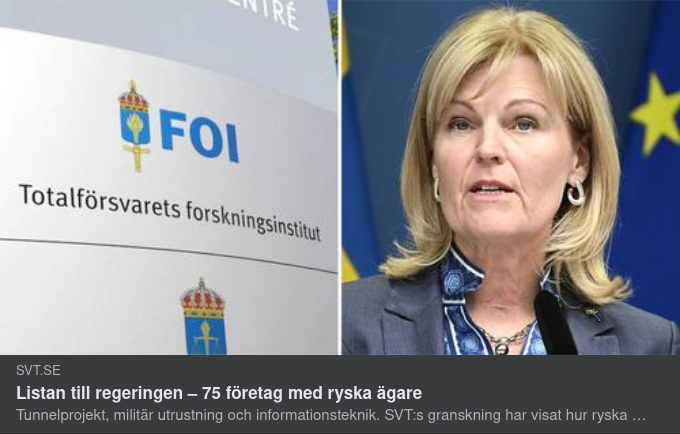 " Tunnelprojekt, militär utrustning och informationsteknik. SVT:s granskning har visat hur ryska oligarker har ekonomiska intressen i skyddsvärda svenska verksamheter. Nu kartlägger FOI ryskt ägande i Sverige – och har lämnat en lista på 75 bolag till regeringen.