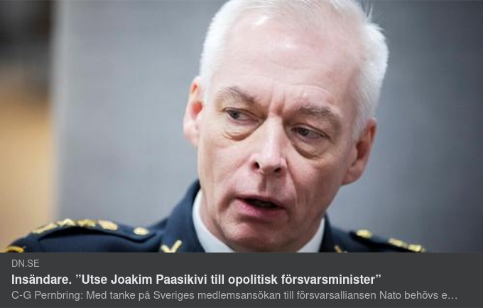 " INSÄNDARE. Med tanke på Sveriges medlemsansökan till försvarsalliansen Nato behövs en militärexpert som högst politiskt ansvarig. Utse Joakim Paasikivi till opolitisk försvarsminister efter valet i höst, skriver C-G Pernbring.