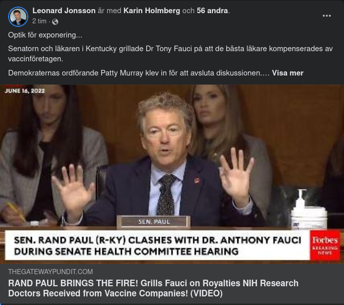 På torsdagen frågade senator Rand Paul Fauci: "Från 2010 till 2016 betalades 27 000 royaltybetalningar ut till 1 800 NIH-anställda. Vi vet det inte för att du berättade det för oss utan för att vi tvingade dig att berätta det för oss genom lagen om informationsfrihet.