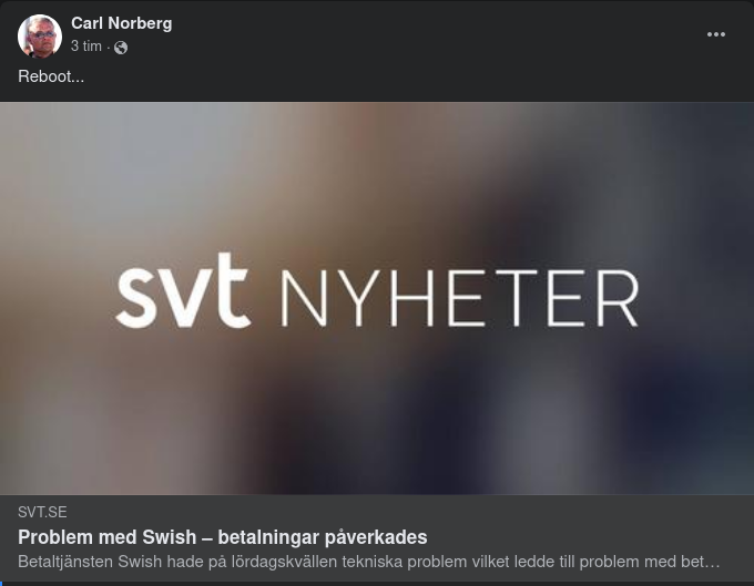 https://www.svt.se/nyheter/inrikes/problem-med-swish-betalningar-paverkas?fbclid=IwAR3EdKYS2qZCfcIQBPzc6_WRSTNvJ6fiejEPt-ECUgqIb1v89jUAEH3UTHo