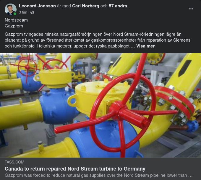 Gazprom tvingades minska naturgastillförseln över Nord Stream-rörledningen lägre än planerat på grund av försenad återkomst av gaskompressorenheter från reparation av Siemens och funktionsfel i tekniska motorer, uppgav det ryska gasinnehavet den 14 juni. Siemens Energy sa en av de gasturbiner kan inte återlämnas till Tyskland från Montreal på grund av Kanadas sanktioner mot Ryssland.