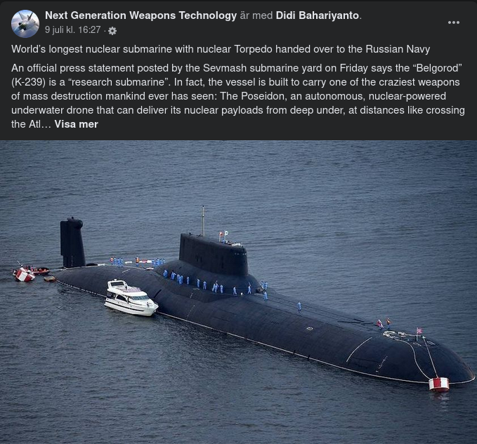 An official press statement posted by the Sevmash submarine yard on Friday says the “Belgorod” (K-239) is a “research submarine”. In fact, the vessel is built to carry one of the craziest weapons of mass destruction mankind ever has seen: The Poseidon, an autonomous, nuclear-powered underwater drone that can deliver its nuclear payloads from deep under, at distances like crossing the Atlantic or Pacific Oceans.