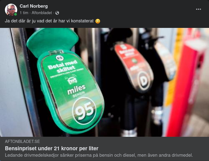 https://www.aftonbladet.se/minekonomi/a/8QeJq2/bensinpriset-under-21-kronor-per-liter?fbclid=IwAR1Pt8QoJze42rkasBmgv1f6t5zYZ9yYP2f4FPFESnOP5Z9_9FbNUhL1kXg