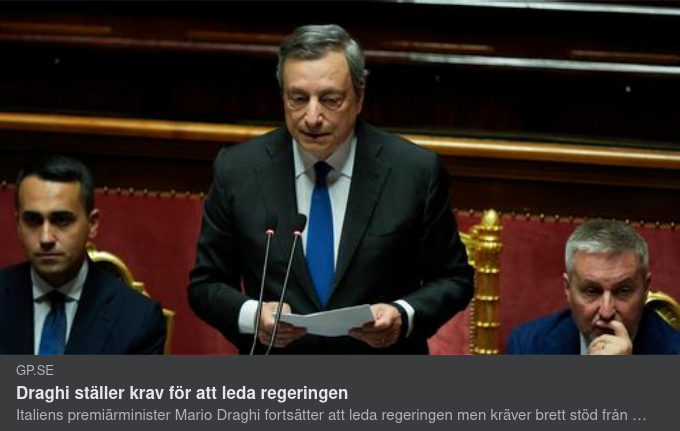 Draghi leder en koalitionsregering där partier från både vänstern och högern ingår. De senaste dagarna har Draghi fört samtal med partierna för att komma fram till en politisk lösning, enligt italienska medier.