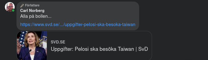 https://www.aftonbladet.se/nyheter/a/RrvvoA/uppgifter-pelosi-besoker-taiwan-trots-varningar?fbclid=IwAR31EWtMofdD_b80erL0RzX1XAx8nFwYDX9WAtMI6sdM21W_iEJ-RyIV8f0