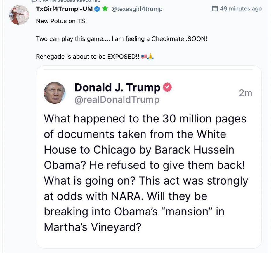 Att släppa videon – troligtvis förberedd för ett sådant här ögonblick, då den ska ha maximalt polariserande genomslag – direkt efter räden är ett snilledrag av Trump: Budskapet är inte bara det som följer när filmen tonar från svartvitt till färg och musiken från moll till dur – att USA med Trump kan bli great igen. Det är också att ”de ger sig på mig, och därmed på er. På USA.” Efter räden twittrar tongivande Trump-anhängare om krig och representanthusets republikanske minoritetsledare Kevin McCarthy påstår att justitiedepartementet har blivit ”ett politiskt vapen”.