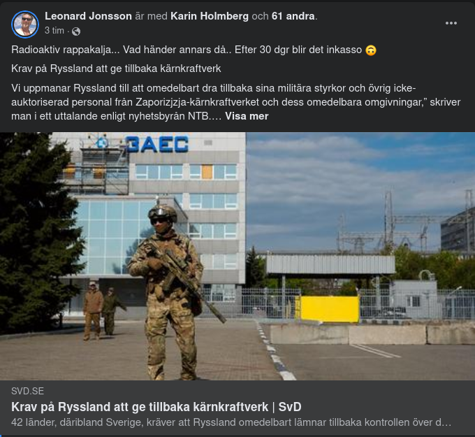 Vi uppmanar Ryssland till att omedelbart dra tillbaka sina militära styrkor och övrig icke-auktoriserad personal från Zaporizjzja-kärnkraftverket och dess omedelbara omgivningar,” skriver man i ett uttalande enligt nyhetsbyrån NTB.