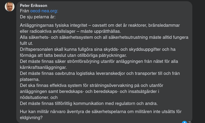 Man påpekar också den ryska militära närvaron utgör en ”stor fara” mot upprätthållandet av de sju pelare för kärnsäkerhet som tagits fram av Internationella atomenergiorganet (IAEA).