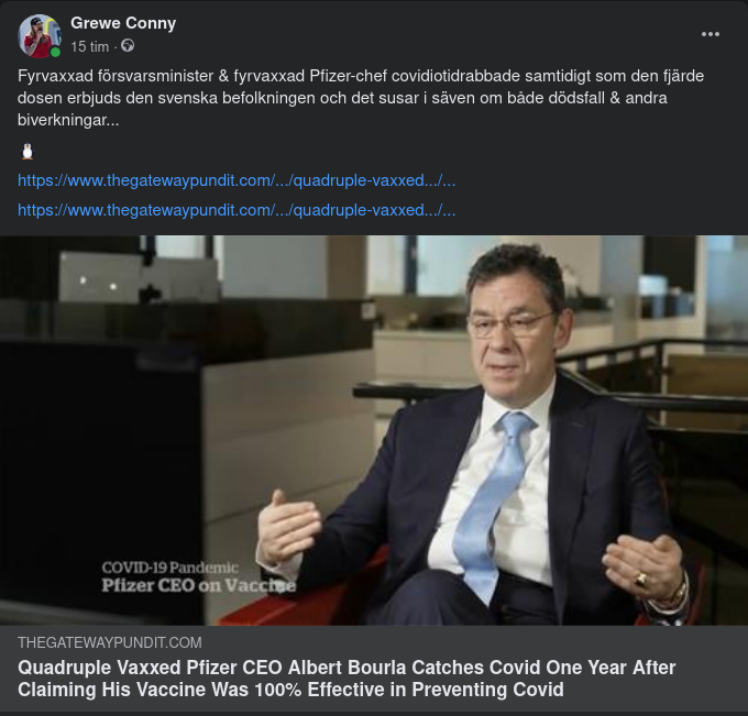 https://www.thegatewaypundit.com/2022/08/quadruple-vaxxed-pfizer-ceo-albert-bourla-catches-covid-one-year-claiming-vaccine-100-effective-preventing-covid/?ff_source=Facebook&ff_medium=PostTopSharingButtons&ff_campaign=websitesharingbuttons&fbclid=IwAR3-a0mTyVAsJfTP8q-hZwQtxcA03_7c0y-sEe_PWCZhbdIfrJm72-tHQlo