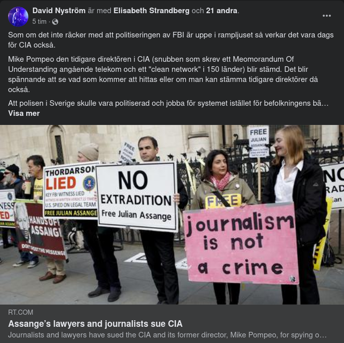 Mike Pompeo den tidigare direktören i CIA (snubben som skrev ett Meomorandum Of Understanding angående telekom och ett "clean network" i 150 länder) blir stämd. Det blir spännande att se vad som kommer att hittas eller om man kan stämma tidigare direktörer då också.