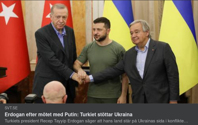 – Medan vi fortsätter våra ansträngningar för att hitta en lösning, förblir vi på våra ukrainska vänners sida, säger Erdogan, enligt nyhetsbyrån AFP.