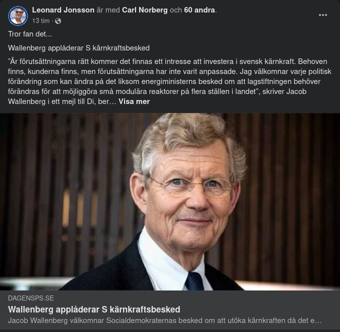 ”Är förutsättningarna rätt kommer det finnas ett intresse att investera i svensk kärnkraft. Behoven finns, kunderna finns, men förutsättningarna har inte varit anpassade. Jag välkomnar varje politisk förändring som kan ändra på det liksom energiministerns besked om att lagstiftningen behöver förändras för att möjliggöra små modulära reaktorer på flera ställen i landet”, skriver Jacob Wallenberg i ett mejl till Di, berättar tidningen.
