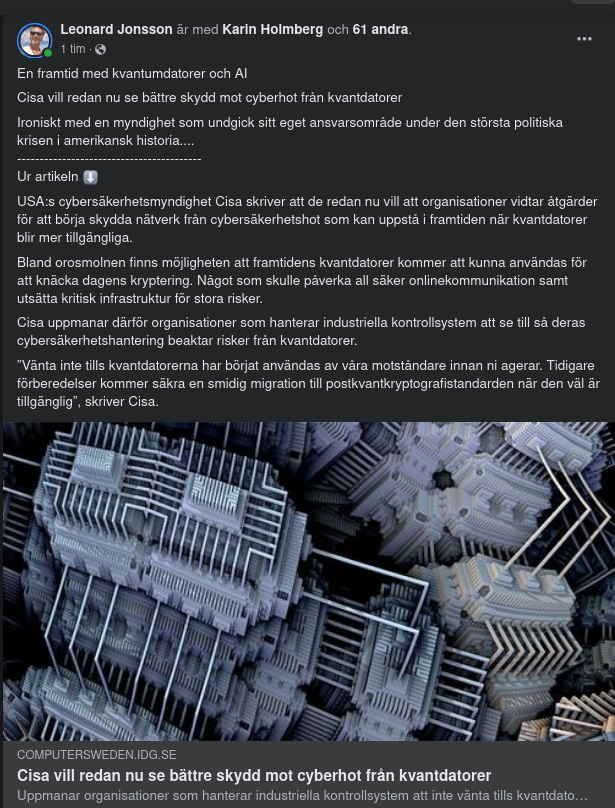 https://computersweden.idg.se/2.2683/1.769729/cisa-vill-redan-nu-se-battre-skydd-mot-cyberhot-fran-kvantdatorer?fbclid=IwAR3CMvMuEOWofdumBOd5vk7vfnC72x2KHr6Zr80ic5bYR3rbmYh-XAhyEgg