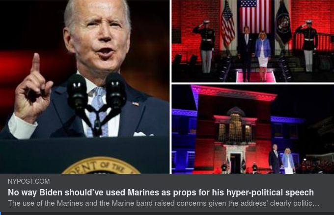 "President Bidens tal i torsdags har kritiserats för sina attacker mot hans politiska motståndare som hot mot nationen. Men för några av oss var optiken lika iögonfallande, med de framträdande placerade marinsoldaterna som inramade presidenten. Användningen av Marines och Marine Band väckte oro med tanke på adressens tydliga politiska syfte. Faktum är att nätverken inte såg det som en adress till nationen och vägrade att ge Vita huset bästa sändningstid.