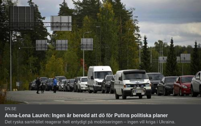 Kontrasten mot Ukraina, där män i stridsför ålder tvärtom reser tillbaka hem för att slåss för sitt land är slående. Samtidigt kan man konstatera att Kremls propagandamaskineri intressant nog inte har lyckats med total hjärntvättning av den ryska befolkningen. Om det var fallet borde militärkommissariaten nu drunkna i frivilliganmälningar. Den ryska befolkningen borde känna sig existentiellt hotade av ”massförstörelsevapnen” som Putin påstår planeras i Ukraina.