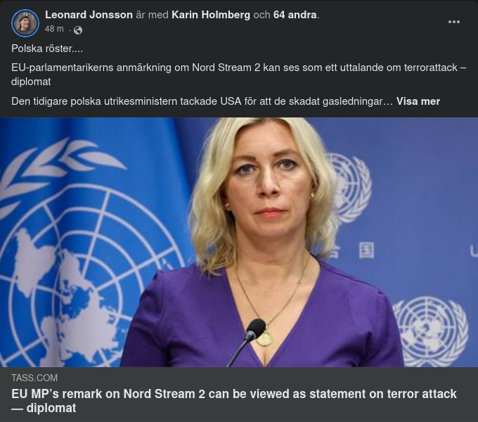 Det ryska utrikesdepartementets officiella talesman, Maria Zakharova, anser att ett uttalande från Polens tidigare utrikesminister, som tackade USA för skadorna på Rysslands Nord Stream 2-rörledning, kan ses som ett officiellt uttalande om att detta är en terrorattack.