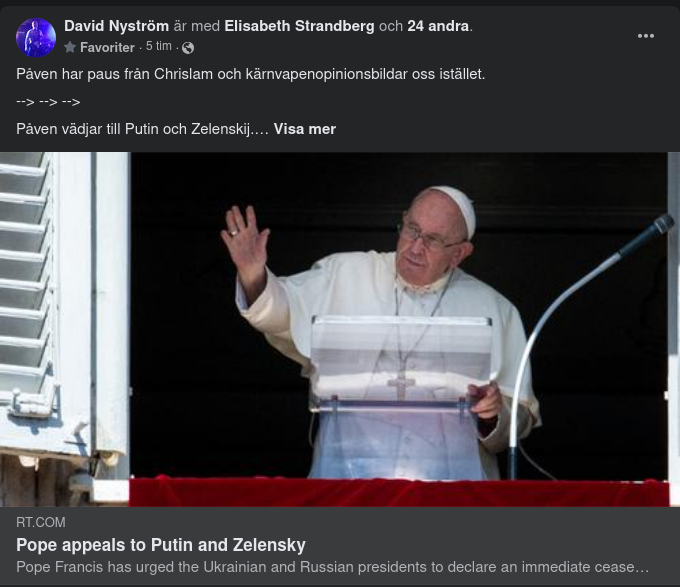 Ukrainas president Vladimir Zelensky och hans ryske motsvarighet, Vladimir Putin, borde utlysa vapenvila och återvända till förhandlingsbordet, sade påven Franciskus i en vädjan till de två ledarna på söndagen. Han varnade för att ytterligare eskalering kan leda till utplacering av kärnvapen, med katastrofala konsekvenser.