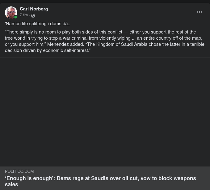 https://www.politico.com/news/2022/10/10/dems-rage-at-saudis-over-oil-cut-vow-to-block-weapons-sales-00061123?fbclid=IwAR2O-awCGUibjU9pJ4M6w-9Dy1ovjveS7eKY9XbVioTD6J1LEG5Oz2NzIC0