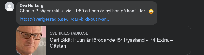 Jo. Jag kollade bara några veckor efter att kriget brutit ut, då hade Saab-aktien gått upp med 70 procent. Och jag vet att jag i samband med det läste en intervju med ett kommunalråd i Karlskoga som var strålande glad. Då känner jag att jag inte kan glädjas på det sättet.
