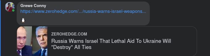 https://www.zerohedge.com/geopolitical/russia-warns-israel-weapons-transfers-ukraine-will-destroy-all-ties?fbclid=IwAR23hXRvBvW9Ld3Wfqqd2tq231RK1g7smtqZAn0kecUXIbZSCGz2GsQ25G8