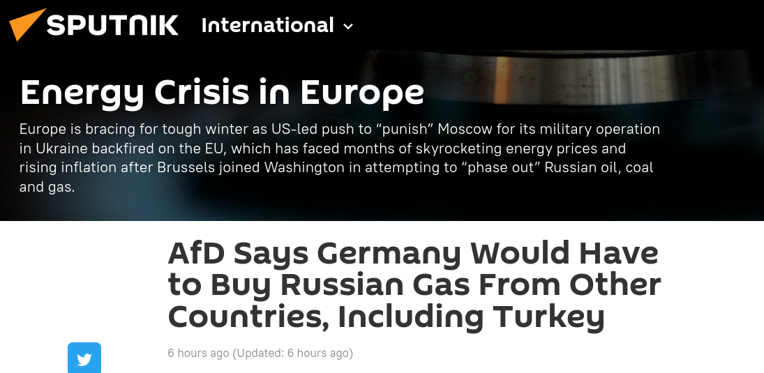 Tyskland skulle behöva köpa rysk energi från andra länder, möjligen från Turkiet, istället för att bli ett gasnav, sa medordföranden för det oppositionella högerpartiet Alternativ för Tyskland (AfD), Tino Chrupalla, till Sputnik.