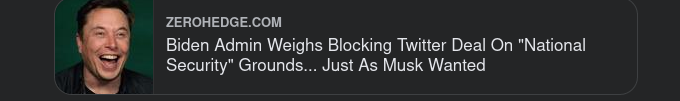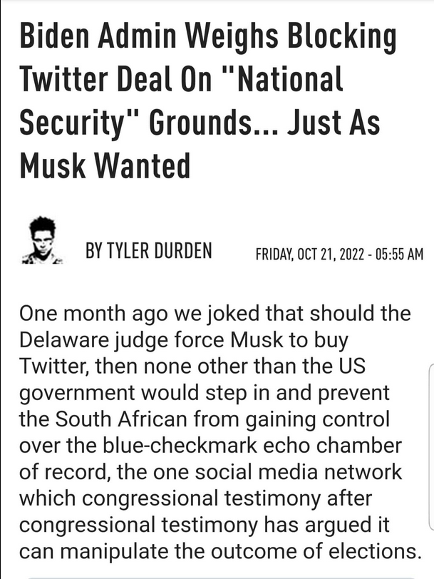 *In short, not only is the deep state government preparing to block Musk's acquisition of TWTR on national security grounds (unlcear what that would achieve as the stock would crater to single digits, especially after today's SNAP earnings, and so many of its employees have already quit), but it may "expropriate" Musk's satellite pet project too, all for daring to ask a question about the US involvement in Ukraine, and what exactly the endgame there is."