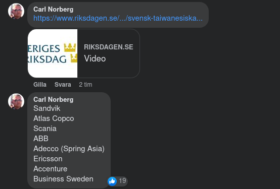 https://www.riksdagen.se/sv/webb-tv/video/interpellationsdebatt/svensk-taiwanesiska-relationer_H910435?fbclid=IwAR1BSyOmptHv3pW1TpbIpKokXWesklNv7sj00lP8JJTQc_BjSe-NaG5XnOI