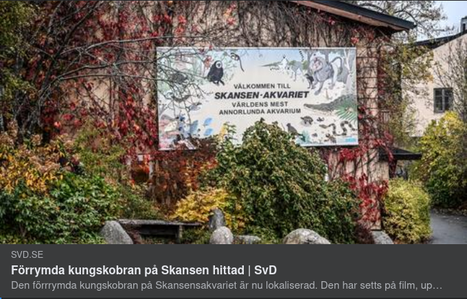 Det var i lördags som Skansenakvariet i Stockholm utrymdes efter att den 2,5 meter långa kungskobran rymt från sitt terrarium.