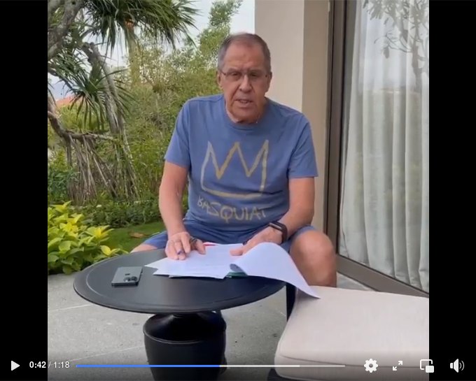 Zakharova postade senare ett kort klipp på Telegram, som visade Lavrov sitta på terrassen på sitt hotellrum i shorts och t-shirt och arbeta med dokument.