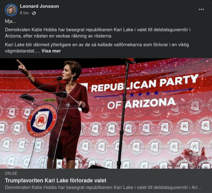 När 98 procent av rösterna räknats har demokraten Katie Hobbs ett övertag på 50,4 procent mot 49,6 procent för republikanen Kari Lake. 20777 röster skiljer kandidaterna åt. Därmed står det klart att ännu en profilerad Trumpkandidat förlorar i mellanårsvalet 2022.
