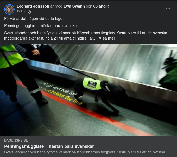 ”Pablo vet hur pengar luktar. Han kan till och med skilja på doften mellan svenska och danska sedlar”, säger danska Tullstyrelsens hundförare Ronald till Dagens Nyheter, som berättar om att de flesta som försökt smuggla ut pengar är svenska medborgare.