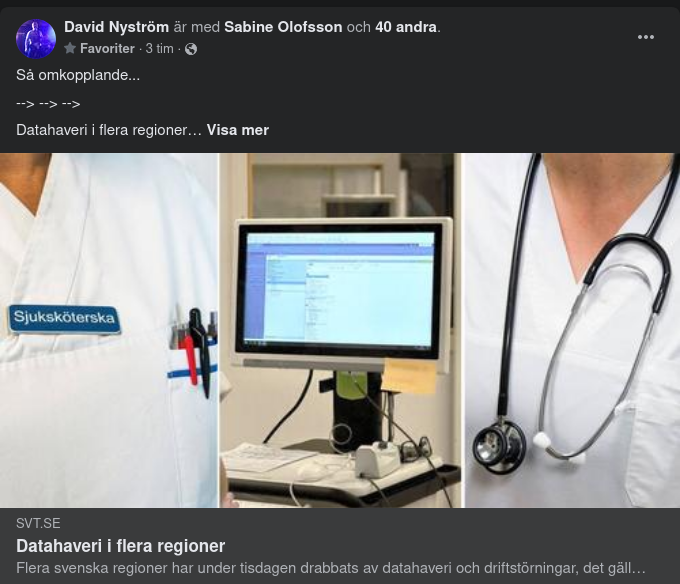 I Region Sörmland är nätverksstörningen omfattande och påverkar vården: bokade besök kan ställas in, och vissa av regionens verksamheter har begränsad kapacitet på grund av felet. Felsökning pågår.