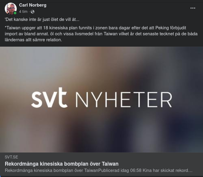 https://www.svt.se/nyheter/snabbkollen/rekordmanga-kinesiska-bombplan-over-taiwan?fbclid=IwAR3mHvYZzqyYVuTCFvKKXQqhDu7OY6hkDGMIbsXabNDAhd2MJDk-CwY-0S8