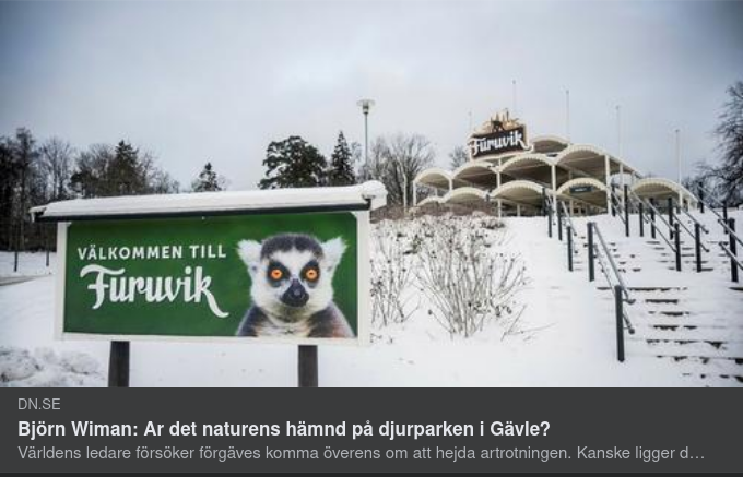 Det är därför en stilfull ironi av schimpanserna på Furuvik att göra sitt uppror mitt under FN:s miljökonferens COP15, där världens ledare förgäves försöker komma överens om att hejda den snabba förlusten av arter och livsmiljöer på jorden. I det som kallas den sjätte massutrotningen hotas i dag uppemot en miljon av jordens åtta miljoner arter av utrotning, många inom de närmaste årtiondena. Artutrotningen kommer, om ingenting görs, att påverka försörjning, utveckling och ekonomi på ett sätt som hotar hela den moderna civilisationen. ”Det som står på spel är själva fundamentet för människans existens”, sade Elizabeth Maruma Mrema, chefssekreterare för FN:s konvention om biologisk mångfald, inför mötet.