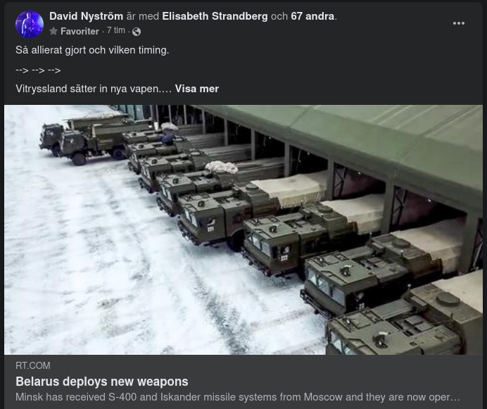 "Idag har vi distribuerat S-400-systemen och, viktigast av allt, Iskander-systemet som du överlämnade till oss, som du lovade för sex månader sedan", sa Lukasjenko till Putin vid en gemensam presskonferens i Minsk.