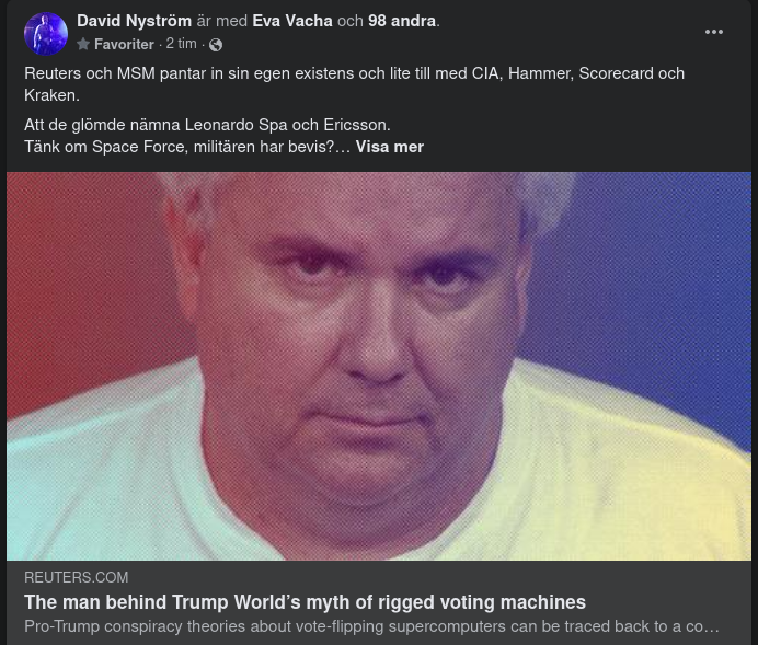 I valets febrila efterdyningar blev dessa och andra obevisade påståenden om Hammer och Scorecard virala och förvandlades till en storslagen global konspirationsteori om hur en mängd olycksbådande karaktärer, ofta knutna till Kina, hade hackat röstsystem för att vända röster från Trump till Biden. Allteftersom den stulna valfiktionen spred sig, blev dess återverkningar också - oseriösa rättegångar som försökte störta valet ; hot om våld mot valarbetare; och välfinansierade kampanjer för att befria Amerika från röstningsmaskiner. Två år senare säger ungefär två tredjedelar av republikanerna att de tror att Trump blev lurad, visar Reuters undersökningar.