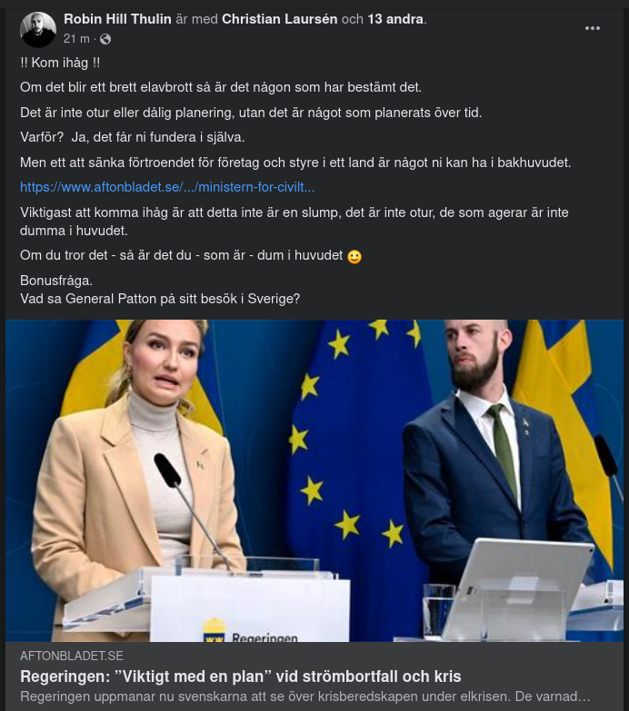 https://www.aftonbladet.se/nyheter/a/zEMgP5/ministern-for-civilt-forsvar-uppmanar-se-over-krisberedskap?fbclid=IwAR23NS-ijocE9VlHQi_WPQRZLqD201Ak_XmdTyvee2LoRbuQNP3WkwYrOdw