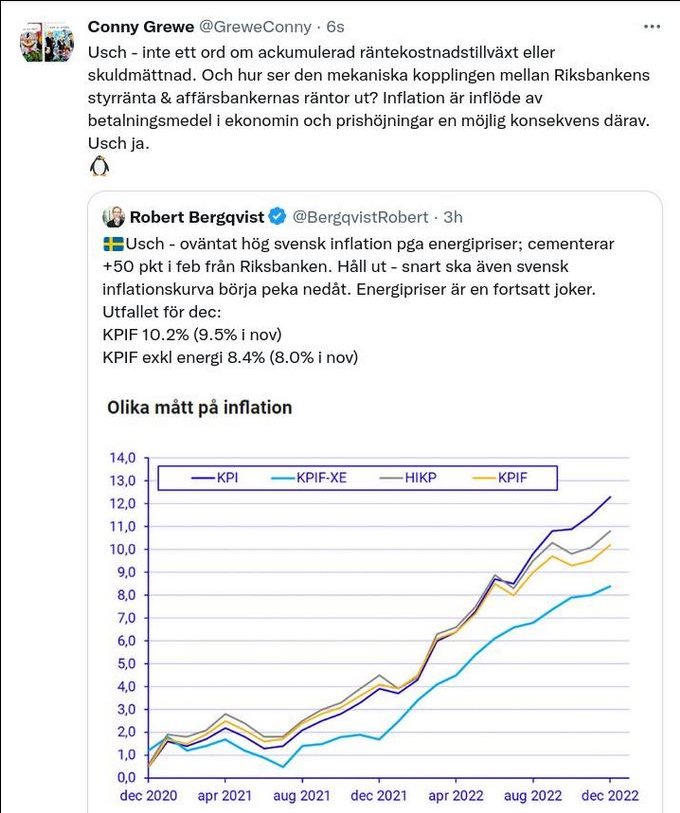 ”Usch”, skriver SEB:s ekonom Robert Bergqvist på Twitter och menar att beskedet cementerar utsikterna om en 50-punktershöjning av styrräntan från Riksbanken i februari. Samtidigt spår han en vändande inflationskurva nedåt, även om energipriserna är ”en joker”.