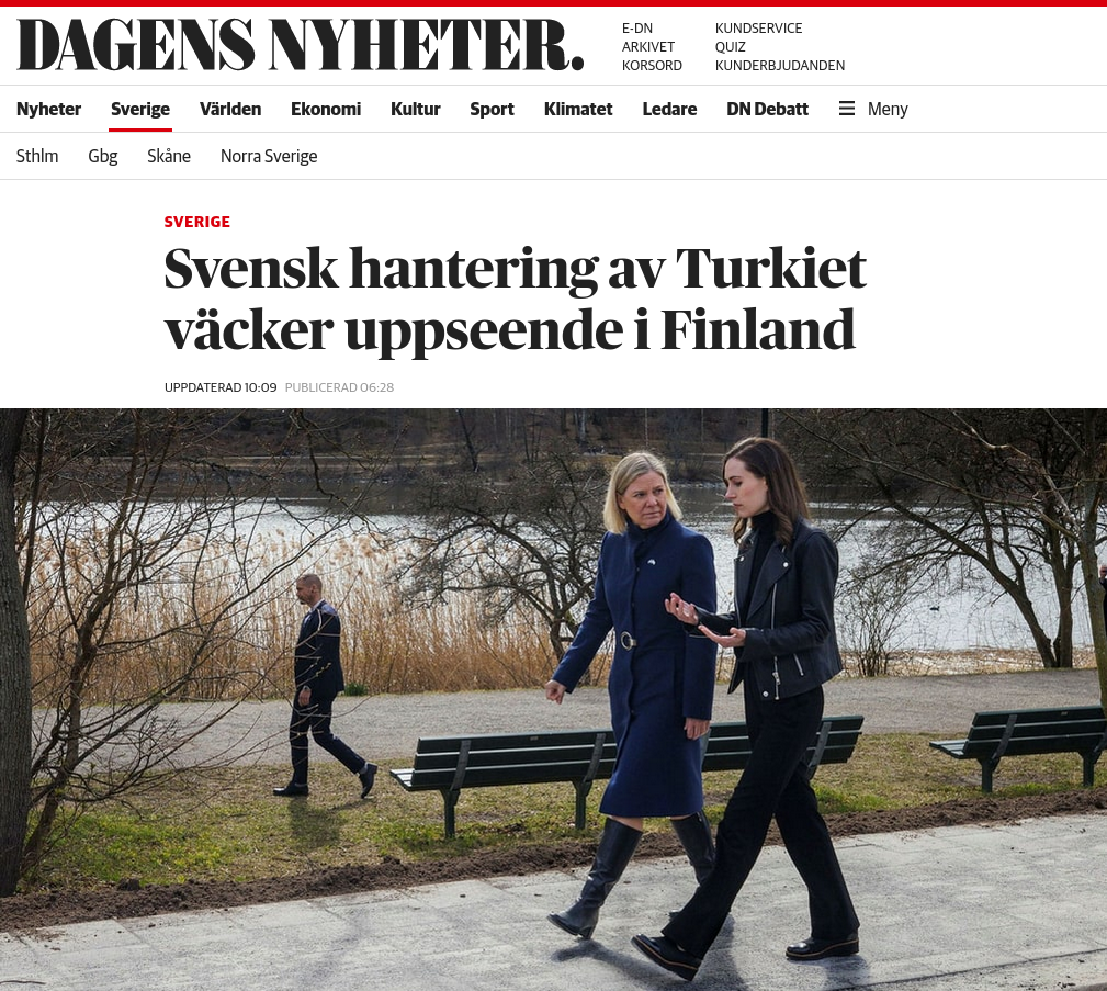 " I grannlandet Finland har Sveriges agerande gentemot Turkiet vid flera tillfällen uppmärksammats. Nu senast efter att en docka föreställande turkiske presidenten Erdogan hängdes upp utanför Stadshuset i Stockholm.