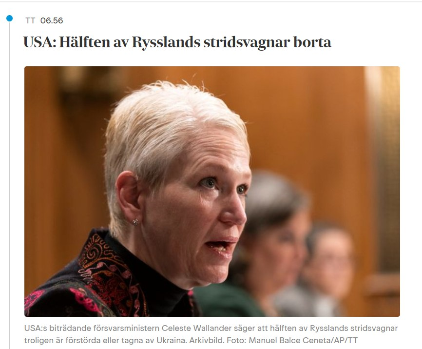 " Hälften av Rysslands stridsvagnar har troligen förstörts eller tagits av Ukraina. Det säger USA:s biträdande försvarsminister Celeste Wallander vid ett evenemang arrangerat av tankesmedjan Center for a New American Security.