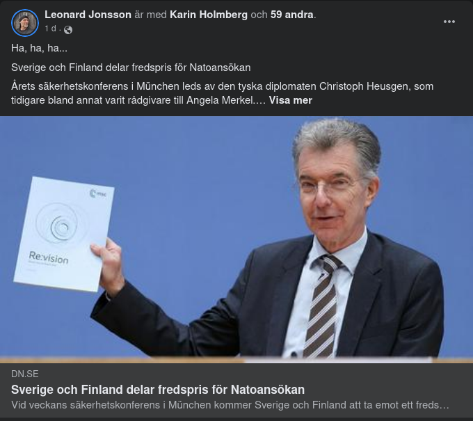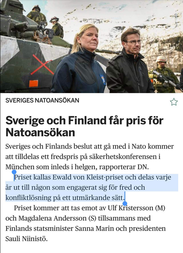 BERLIN. Vid säkerhetskonferensen i München i slutet av veckan kommer Sverige och Finland att ta emot ett fredspris. Skälet är att länderna, som en reaktion på Rysslands anfallskrig, bestämt sig för att gå med i Nato.
