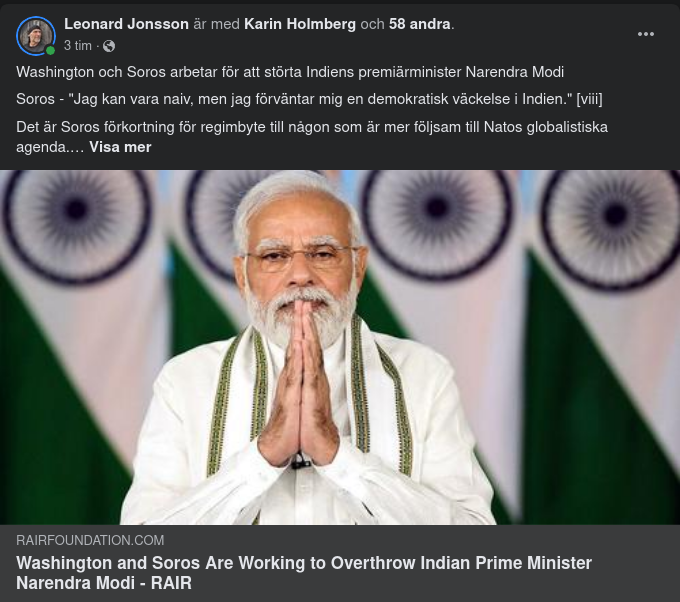 Skulle inte Ericsson --> Red Bee Media kunna vara en gemensam nämnare? --> --> --> https://www.rt.com/india/571852-india-new-delhi-bbc-modi/?fbclid=IwAR3XIxBKSUyjhuObufwunnIN86xXs1vD0CLkxVLG2wNYpJUeoTROcbsy1Jo Indiens sammandrabbning med BBC är en varning för saker som kommer. Västmakter är vänskapliga med New Delhi nu, men vad händer när de börjar se det som en rival? Nyligen har det varit upprördhet över hela Indien över en BBC-dokumentär. Med titeln "Modi-frågan" belyser programmet ett kritiskt ljus över vad det påstås vara den indiske premiärministerns roll i antimuslimska upplopp som skakade staten Gujarat 2002. Indiska myndigheter reagerade genom att förbjuda dokumentären och fördöma den som "kolonial propaganda" . Sådan känslighet är vanlig i dagens Indien, som under Narendra Modis ledning har styrt in på en väg av hinduisk nationalism, vilket har lett till att landet är mer benäget att bli upprörd över internationell kritik och att bli mindre "liberal" till sin natur . Några veckor efter att dokumentären släpptes utreddes BBC i Indien för påstådda skattebrott. Sändningsföretagets svar betonade dess status som en " pålitlig, oberoende medieorganisation", och bevakningen av skatteutredningen har antytt att den är politiskt motiverad. Men denna bråk kommer vid ett kritiskt ögonblick i geopolitiken där västländer aktivt uppvaktar New Delhi som en del av sina Indo-Stillahavsinitiativ. Mer specifikt, deras försök att använda Indien och dess enorma ekonomiska potential som ett strategiskt bålverk för att begränsa Kina. Frågan är dock hur länge västvärldens smekmånad med New Delhi kan pågå? Särskilt när, under rådande förhållanden, Indien kan besluta att fullfölja styrelsebeslut som inte är i harmoni med de värderingar som de västerländska nationerna förkunnar att upprätthålla. När allt kommer omkring ses lutningen mot Indien med en viss romantik i västländerna, vars tjänstemän hyllar det som "världens största demokrati" och en partner med " delade värderingar". ” Sanningen är dock att de inte riktigt ser Indien som en jämlik. De hoppas, med tanke på grunderna för dess politiska system, att Indien en dag kommer att vara " samma" som de är, och förutse en kurs av liberalisering och politisk förändring under deras ledning, liknande vad som en gång förväntades från Ryssland och Kina. Men om Indien misslyckas med att följa den vägen, eller fortsätter att växa som en autonom makt som inte samtycker till västerländsk dominans, är chansen stor att västvärldens tolerans för landet, och särskilt för Modis regering, kommer att ta slut. Detta för oss till BBC. Indiska myndigheter har rätt i att beskriva BBC som en "postkolonial" institution eftersom det är vad det är. BBC World Service är inte alls opartisk, utan en institution skapad med det imperialistiska målet att projicera brittiskt inflytande utomlands, med särskild uppmärksamhet på det brittiska imperiets tidigare dominans. BBC är ideologiskt partisk och har föga överraskande fått kritik i Indien för sin nedlåtande bevakning. Storbritannien ser på Indien med stjärnögd nostalgi. Den ser inte sin hundraåriga historia av kolonialt styre över subkontinenten som en tid av exploatering, förtryck, våld och ojämlikhet. Istället tenderar det att tro att det har gjort landet en tjänst genom att öka dess utveckling, och att denna historia ger det en " särskild relation " med New Delhi. Därför, även om Storbritanniens Brexit-ideologi eftersträvar betydande handels- och ekonomiska fördelar från Indien, anser Storbritannien fortfarande att de har rätt att blanda sig i dess interna politik, med Modis nationalistiska och centraliserade regel som placerar dem på en långsiktig kollisionskurs. Saker och ting är relativt stabila nu, trots denna "bråk" över dokumentären, men detta ställer frågan - vad händer när Indien blir rikt och mäktigt och inte ivrigt accepterar den västcentrerade politiska världsordningen? Och vad händer om den försöker vara en geopolitisk makt i sina egna termer? Vad händer när västländer börjar uppfatta Indien inte som en partner i behov av hjälp och stöd, utan som en rival på samma sätt som de ser på Kina och, naturligtvis, Ryssland? Vad händer när det USA-ledda Indo-Pacific-initiativet inte börjar framstå som något som skulle införliva och hjälpa Indien, utan något som också potentiellt skulle kunna innehålla dess militära uppgång? Denna BBC-dokumentär är en påminnelse till Indien om att det kollektiva västvärlden inte försöker bli vän med den, utan att använda den, och i sin tur kommer sannolikt inte att acceptera ett Indien som inte följer dess politiska villkor. Indiens nuvarande utrikespolitik beskrivs ofta som " strategisk autonomi ", men under de senaste åren har landet varit alltför vänligt med USA för att utnyttja ömsesidiga anti-Kina-sentiment i ett försök att skaffa sig ekonomiska möjligheter. Samtidigt har det skett ett inrikespolitiskt skifte i Indien som orienterar det bort från västerniseringen. Västvärldens goda vilja för New Delhi, en supermakt i framtiden, kommer en dag att ta slut, och agendan kommer att skifta mot inneslutning. Indien måste titta på vad som händer nu med Kina och vara redo när den dagen kommer.Washington och Soros arbetar för att störta Indiens premiärminister Narendra Modi Soros - "Jag kan vara naiv, men jag förväntar mig en demokratisk väckelse i Indien." [viii] Det är Soros förkortning för regimbyte till någon som är mer följsam till Natos globalistiska agenda. https://rairfoundation.com/washington-and-soros-working-to-overthrow-indian-prime-minister-narendra-modi/?fbclid=IwAR2sX8Ngbc77ye7dnKRtIvLQuLE8gvKyw-sipK9vDZgDjB_Dz7oSJ748YtA En av Rysslands mest kritiska ekonomiska partner, mitt i de oöverträffade västerländska ekonomiska sanktionerna från Washington och EU över Ukraina