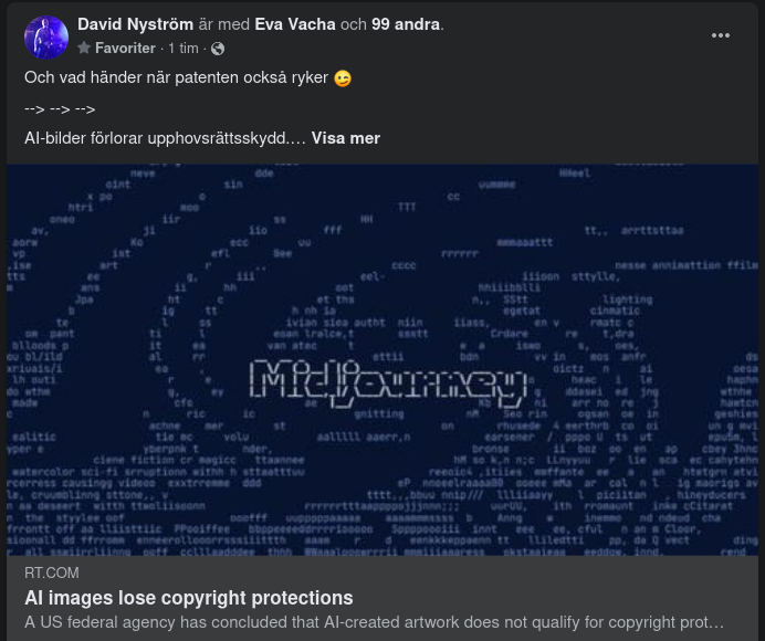 Och vad händer när patenten också ryker --> --> --> https://www.rt.com/news/571952-artificial-intelligence-art-copyright/?fbclid=IwAR0ZG6ABuyxaNobn9VlngqAeiBi-hAM_5ikJtlAcz_FjZIv2t67iV-ODnpI AI-bilder förlorar upphovsrättsskydd. Beslutet från det amerikanska upphovsrättskontoret är bland de första att ta itu med AI-genererade konstverk och immateriella rättigheter. En amerikansk federal myndighet har dragit slutsatsen att konstverk gjorda med artificiell intelligens inte kvalificerar sig för upphovsrättsskydd, och säger att sådana bilder inte skapades av en människa och inte kan registreras som legitima IP. USA:s upphovsrättsbyrå beskrev sin ståndpunkt i ett nyligen brev till den grafiska romanförfattaren Kris Kashtanova, som försökte registrera ett verk som innehöll bilder skapade med hjälp av "Midjourney" AI-programvaran. Kontoret skulle bara gå med på upphovsrättsliga element skrivna och arrangerade av en mänsklig författare. "Det faktum att Midjourneys specifika utdata inte kan förutsägas av användare gör Midjourney annorlunda i upphovsrättsliga syften än andra verktyg som används av artister", stod det i brevet och tillade " Processen genom vilken en Midjourney-användare får en ytterst tillfredsställande bild genom verktyget är inte samma som en mänsklig konstnär, författare eller fotograf." Midjourney-systemet använder textuppmaningar som användarna anger för att generera unika bilder, som speglar liknande AI-baserade program som snabbt har vuxit i popularitet de senaste åren, såsom DALL-E djupinlärningsmodellen. Användningen av datorgenererad konst har väckt kontroverser både bland kreatörer och konsumenter, med kritiker som varnar för att automatiserade system en dag kan ersätta mänsklig kreativitet och beröva konstnärer sitt arbete . Med artificiell intelligens som utvecklas i en rasande takt har domstolarna ännu inte avgjort ett antal frågor kring immateriella rättigheter och AI-konst, vilket gör att kreatörer befinner sig i ett juridiskt limbo. I sitt brev förklarade Copyright Office att vissa etablerade riktlinjer kunde tillämpas på AI-bilder, och noterade att verk måste vara " oberoende skapade av författaren" och ha "tillräcklig kreativitet." "I fall där icke-mänskligt författarskap hävdas, har appellationsdomstolar funnit att upphovsrätten inte skyddar de påstådda skapelserna", heter det, med hänvisning till flera tidigare domstolsbeslut. En advokat för Kashtanova uppgav att hennes grafiska roman borde registreras för upphovsrätt eftersom hon " författare till varje aspekt av verket", och hävdade att Midjourney-programvaran bara var ett "hjälpmedel". Kontoret accepterade inte det argumentet, men vägrade till slut att registrera någon del av hennes bok skapad med AI. Kashtanova hyllade ändå beslutet som "goda nyheter", och noterade att kontoret tillät upphovsrätt för hennes romans berättelse och "sättet bilderna var arrangerade på." Hon tillade att riktlinjerna som lagts skulle skydda "många användningsområden för människorna i AI-konstgemenskapen."