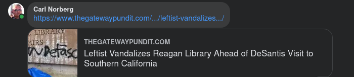 https://www.thegatewaypundit.com/2023/03/leftist-vandalizes-reagan-library-ahead-of-desantis-visit-to-southern-california/?fbclid=IwAR0TYkmBs4dz7z00bQiZCi6JarB0PrYCNkyXFz1m4_bznmDpDQClVAMLsMc