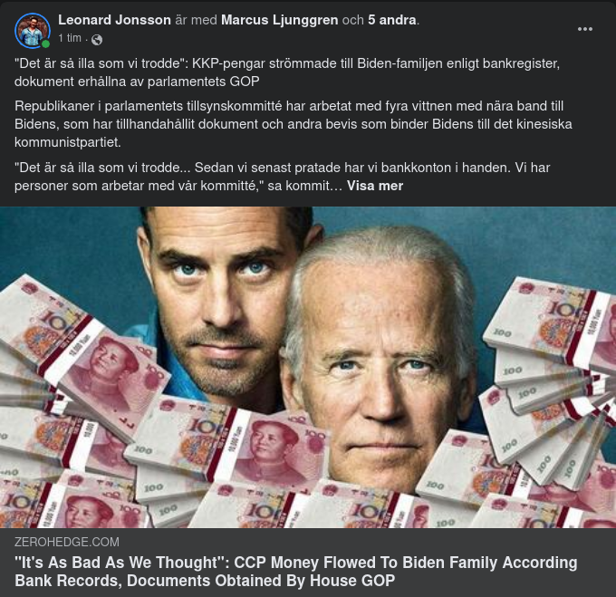 https://www.zerohedge.com/political/its-bad-we-thought-ccp-money-flowed-biden-family-according-bank-records-documents?fbclid=IwAR3BpBCZjEf2e_0ZI799ARMwv5GdVoUHihK1P3jMChxC11AiiBfVLhCNDac "Det är så illa som vi trodde": KKP-pengar strömmade till Biden-familjen enligt bankregister, dokument erhållna av parlamentets GOP Republikaner i parlamentets tillsynskommitté har arbetat med fyra vittnen med nära band till Bidens, som har tillhandahållit dokument och andra bevis som binder Bidens till det kinesiska kommunistpartiet. "Det är så illa som vi trodde... Sedan vi senast pratade har vi bankkonton i handen. Vi har personer som arbetar med vår kommitté," sa kommitténs ordförande James Comer (R-KY) till Fox News 'Maria Bartiromo på söndagen . Morgonterminer." "Under de senaste två veckorna har vi träffat antingen dessa individer personligen eller med deras advokater. Och det skulle vara fyra individer som hade kopplingar till familjen Biden i deras olika planer runt om i världen. Så nu har vi dokument i hand som vi har dokument i handen som visar hur familjen Biden fick pengar från det kinesiska kommunistpartiet. " Se Twitter video https://twitter.com/i/status/1634941697791516673