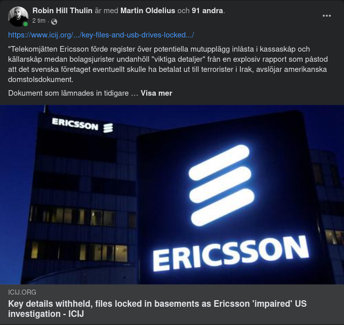 https://www.icij.org/investigations/ericsson-list/key-files-and-usb-drives-locked-away-in-ericssons-basement-justice-department-says/?fbclid=IwAR0t_PullzJ7BCKYXl2VxrJpjhuyN2UfauSLXyrHfTtcViKeHcPtItV17ig "Telekomjätten Ericsson förde register över potentiella mutupplägg inlåsta i kassaskåp och källarskåp medan bolagsjurister undanhöll "viktiga detaljer" från en explosiv rapport som påstod att det svenska företaget eventuellt skulle ha betalat ut till terrorister i Irak, avslöjar amerikanska domstolsdokument. Dokument som lämnades in tidigare denna månad i federal domstol i New York av det amerikanska justitiedepartementet säger också att Ericsson-anställda inte avslöjade bevis för korrupta betalningar som finns på USB-enheter i så många som sex år, trots en pågående brottsutredning. De senaste avslöjandena kommer samtidigt som Ericsson, en nyckelspelare i västvärldens kamp med Kina om framtiden för global kommunikation, ska erkänna sig skyldig till tidigare mutanklagelser i federal domstol den 21 mars. Företaget gick redan denna månad med på att betala ett straff på 206.7 miljoner dollar för att ha brutit mot sitt 2019-uppskjutna åtalsavtal med justitiedepartementet för att lösa vad åklagare kallade en "årslång korruptionskampanj" i Kina, Indonesien, Kuwait, Djibouti och Vietnam mellan 2000-2016. En liknande utredning av den amerikanska finansinspektionen fann korrupta aktiviteter från Ericsson i Saudiarabien. Enligt avtalet från 2019 betalade Ericsson 1 miljard dollar och lovade att utrota korruption och rapportera fler oegentligheter till den amerikanska regeringen. Men Ericsson bröt sina löften genom att dölja anklagelser om mutor i minst tre länder, däribland Irak."