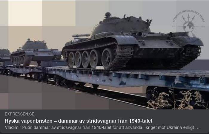 Så då visste alltså Stalin om att det kalla kriget skulle komma redan på 1940-talet? Ja Wagnerknektarna har nog inte ännu börjat beskjutas av ryska reguljära enheter, så de kämpar för sina liv på mot de Ukrainska legoknektarna och den Djupa Staten. Eller blev det lite fel här för denne Soxbo, igen.. https://www.expressen.se/nyheter/ryska-vapenbristen-dammar-av-stridsvagnar-fran-1940-talet/?fbclid=IwAR1llwyyKSlkOcOoPpJ2oi-veMxrujInAcAQBeCs9FPIXM04MlQG5huHLKQ "Vladimir Putin dammar av stridsvagnar från 1940-talet för att använda i kriget mot Ukraina enligt grävnätverket CIT. ”Detta visar tydligt hur grava de ryska styrkornas problem med tillgången på militärfordon faktiskt är”, skriver CIT. Brittiska underrättelseuppgifter avslöjade i januari att Ryssland har problem med att tillverka stridsvagnar i tillräckligt snabb takt för att ersätta de som går som förlorade i kriget med Ukraina. Grävnätverket Conflict Intelligence Team (CIT) har nu lagt upp fotografier som visar ryska stridsvagnar av äldre modell ombord på ett tåg. Det rör sig enligt CIT om stridsvagnar av typen T-54 som började tillverkas på 1940-talet samt efterföljaren T-55. ”Detta är första gången man observerat T-54-stridsvagnar tas ur malpåse”, skriver CIT. Tåget ska nyligen ha lämnat staden Arsenjev, en av platserna där ryska militärens stridsvagnar förvaras och repareras. ”Visar tydligt hur grava de ryska styrkornas problem är” Ryssland har tidigare börjat använda stridsvagnar av typen T-62, som började tillverkas på 1960-talet, i kriget. Ett tåg lastat med T-62-stridsvagnar på väg till fronten filmades i oktober efter att ha avgått från just Arsenjev. T-54-stridsvagnarna har enligt CIT ”allvarliga brister” såsom ”primitivt” sikte och ”undermåligt” vapensystem. ”Detta visar tydligt hur grava de ryska styrkornas problem med tillgången på militärfordon faktiskt är”, skriver CIT. Har förlorat över 1 800 stridsvagnar Ryssland har förlorat över 1 800 stridsvagnar sedan invasionen inleddes förra året enligt granskningskollektivet Oryx medan Ukraina bedömer att det i själva verket rör sig om dubbelt så många. ”Ryska armén har nått en punkt när man inte längre är kapabel att ersätta förlorad utrustning med vapen som ens är i närheten av att inneha samma värde i strid”, skriver Oryx som tror att detta kommer att leda till en ökning av antalet ryska soldater som dödas i kriget."